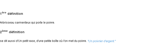 Ancienne signification éditée par l’Académie Française, année 1798.Merci à Nathalie et Edgard pour la numérisation du mot poivrier.