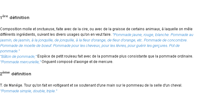 Ancienne signification issue du dico de l’Académie Française, parue en 1798.Merci à Brice et Ghislain pour la numérisation du mot pommade.