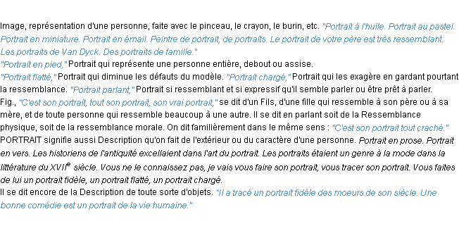 Ancienne définition développée dans dictionnaire académique, 1798.Merci à Mélissa et Benoit pour la numérisation du mot portrait.