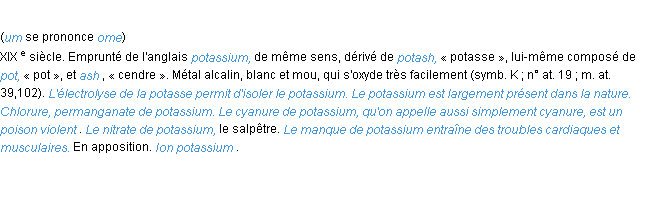 Définition du mot « potassium » par l’équipe de la-definition.fr (édition de 2011).Merci à Rémy et Florianne pour la numérisation du mot potassium.