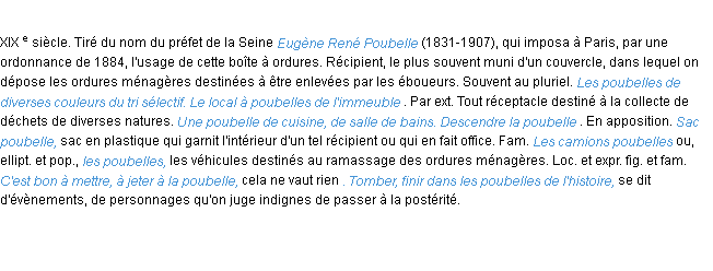 Définition issue du dictionnaire wiktionary pour le mot « poubelle ».Merci à Cerise et Angelique pour la numérisation du mot poubelle.