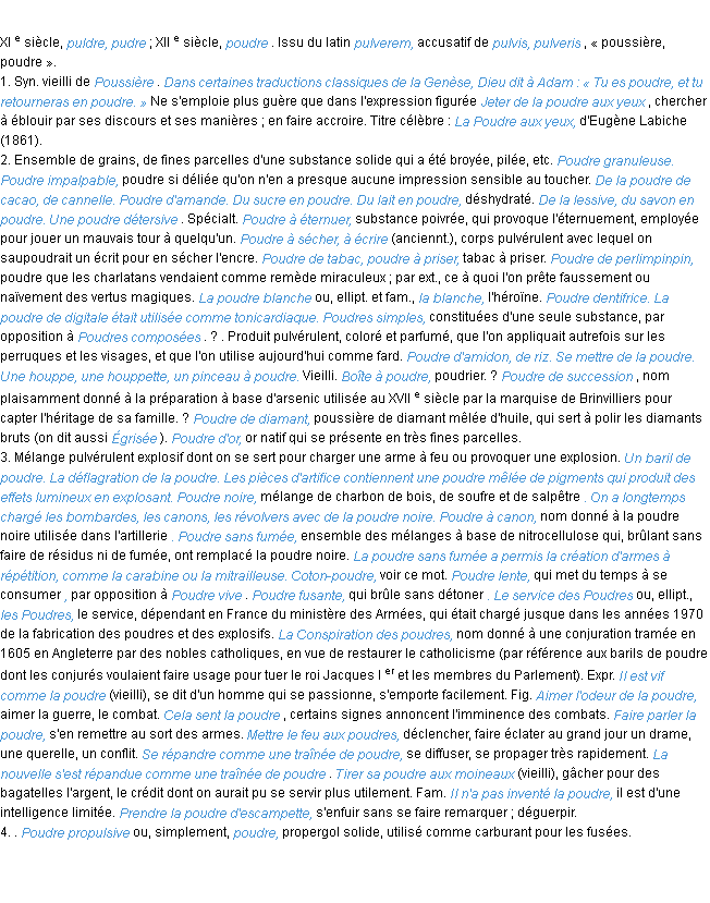 Définition de l’Académie Française (édition de 1932) pour le mot « poudre ».