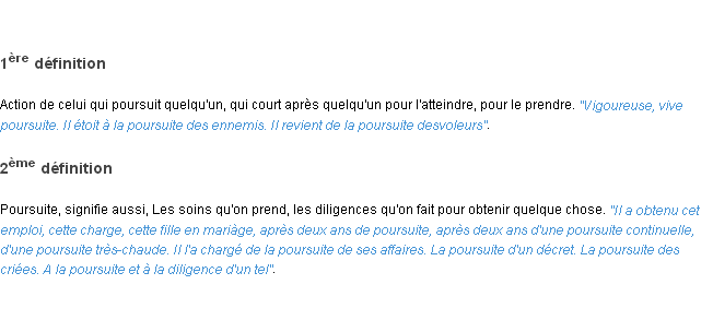 Ancienne signification parue en 1798 dans dictionnaire de l’Académie Française.Merci à Eloi et Clementine pour la numérisation du mot poursuite.