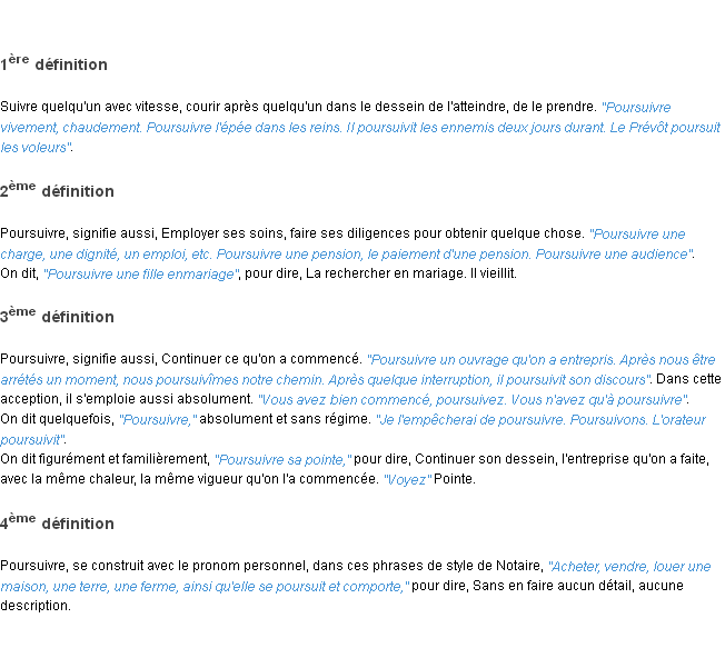 Signification parue en 2009 (source la-definition.fr).Merci à Léonard et Odile pour la numérisation du mot poursuivre.