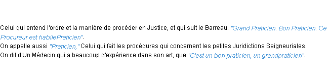 Définition du mot « praticien » (source wiktionary 2011).Merci à Géraud et Faustine pour la numérisation du mot praticien.