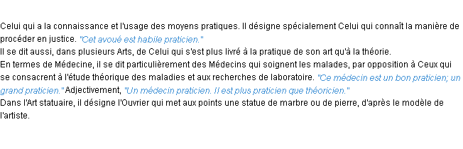 Ancienne définition de l’Académie Française (édition de 1798) pour le mot « praticien ».
