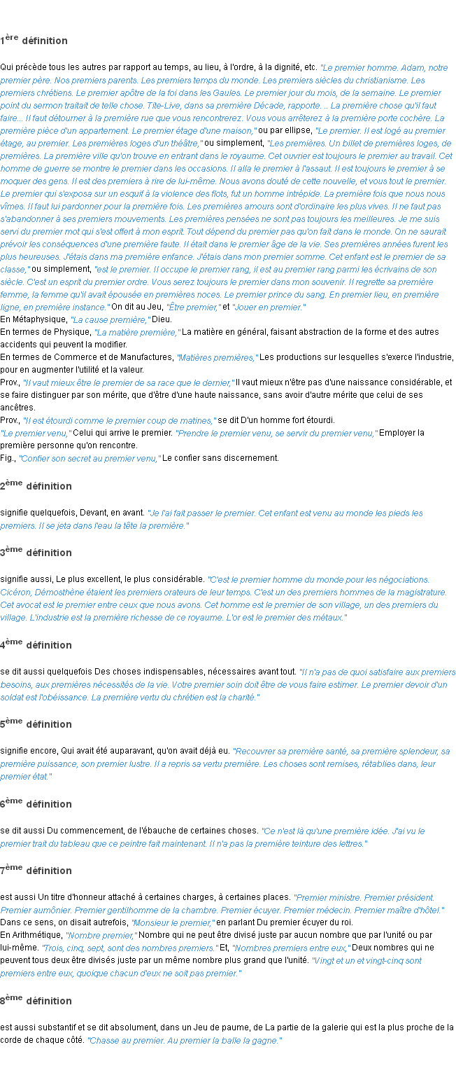 Ancienne définition de l’Académie Française (édition de 17962) pour le mot « premier ».Merci à Mireille et Marie pour la numérisation du mot premier.