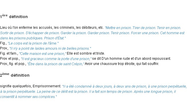 Signification éditée en 2010 par l’équipe de la-definition.fr.Merci à Jérôme et Bénédicte pour la numérisation du mot prison.