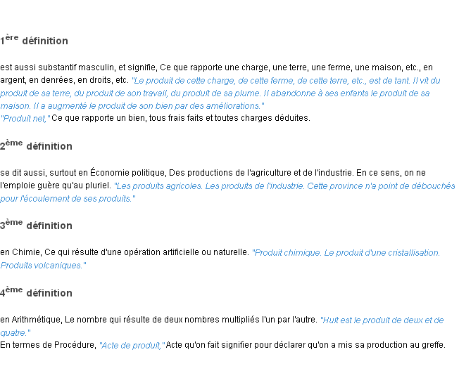Définition du mot « produit » par l’équipe de la-definition.fr (édition de 2011).Merci à Rémy et Sébastienne pour la numérisation du mot produit.