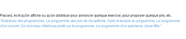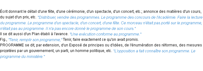 Signification parue en 2009 (source la-definition.fr).Merci à Lucille et Arnaude pour la numérisation du mot programme.