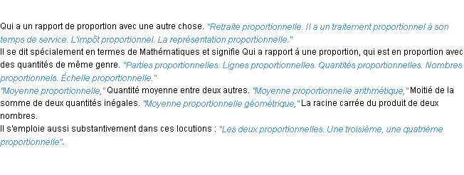Signification éditée en 2010 par l’équipe de la-definition.fr.Merci à Paschal et Désiré pour la numérisation du mot proportionnel.