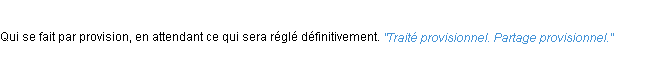 Signification éditée en 2010 par l’équipe de la-definition.fr.Merci à Béatrice et Geneviève pour la numérisation du mot provisionnel.