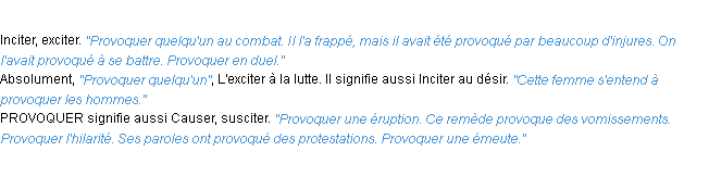 Signification parue en 2009 (source la-definition.fr).Merci à Berthe et Theirn pour la numérisation du mot provoquer.