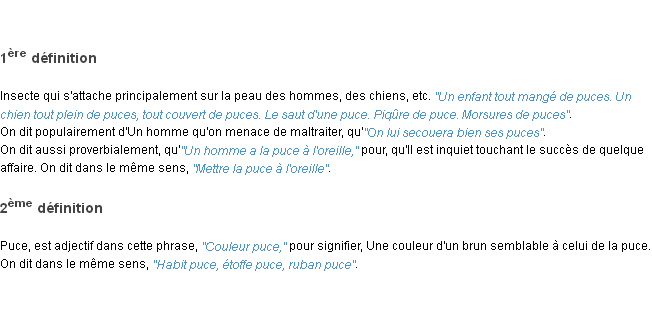 Signification éditée en 2010 par l’équipe de la-definition.fr.Merci à Océane et Camille pour la numérisation du mot puce.