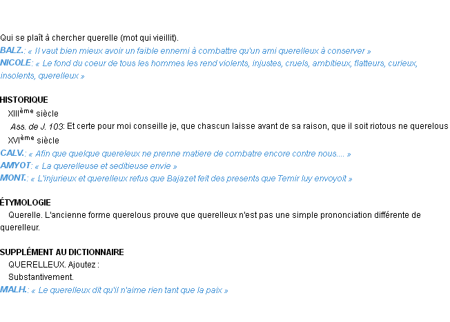 Définition d’Emile Littré (édition de 1876) pour le mot « querelleux ».Merci à Guillaume et Françoise pour la numérisation du mot querelleux.