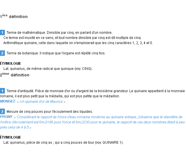 Signification du terme « quinaire », parution de 1876 (dictionnaire le Littré).Merci à Cerise et Jacques pour la numérisation du mot quinaire.