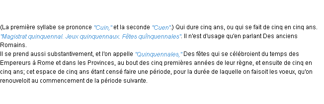 Définition développée dans dictionnaire d’Emile Littré (ancienne édition de 1876).Merci à Célestine et Noel pour la numérisation du mot quinquennal.