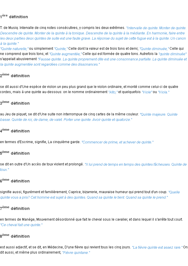 Ancienne définition « quinte » du dictionnaire académique Français, parution de l’année 1835.