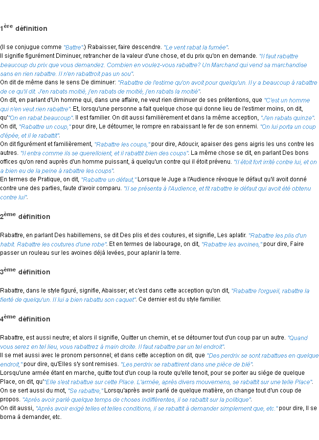 Définition du mot « rabattre » par l’équipe de la-definition.fr (édition de 2011).Merci à Dorothée et Joséphine pour la numérisation du mot rabattre.