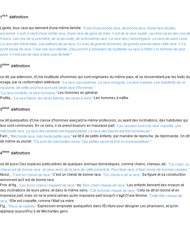 Signification éditée en 2010 par l’équipe de la-definition.fr.Merci à François et Antoine pour la numérisation du mot race.