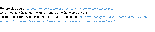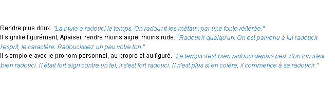 Signification du terme « radoucir », parution de 1876 (dictionnaire le Littré).Merci à Berthe et Patrice pour la numérisation du mot radoucir.