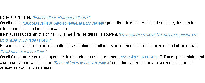 Ancienne signification du terme « railleur », parution de 1835, dictionnaire académique Français.