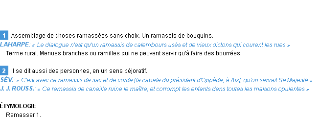 Définition développée dans dictionnaire d’Emile Littré (ancienne édition de 1876).Merci à Manon et Gratien pour la numérisation du mot ramassis.