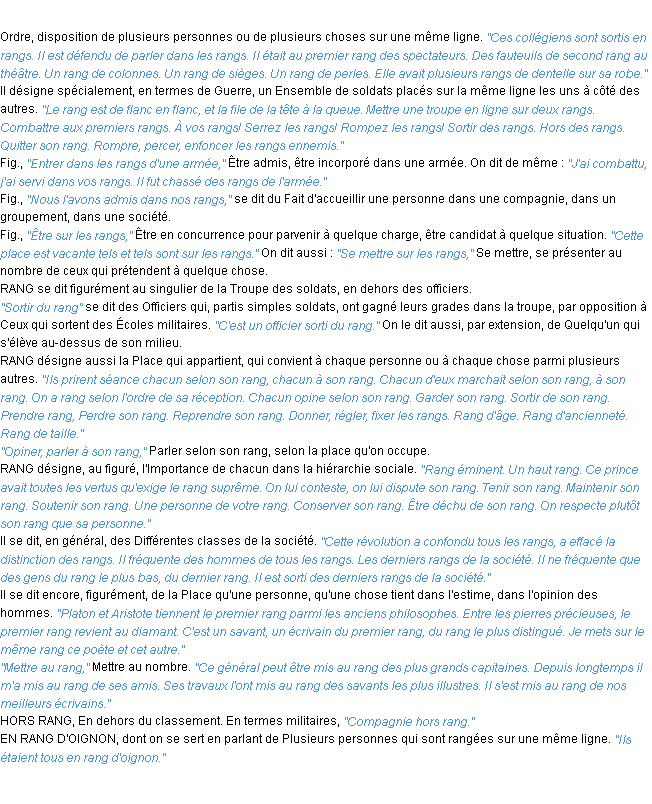 Signification éditée en 2010 par l’équipe de la-definition.fr.Merci à Jérôme et Honoré pour la numérisation du mot rang.