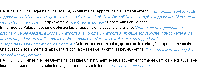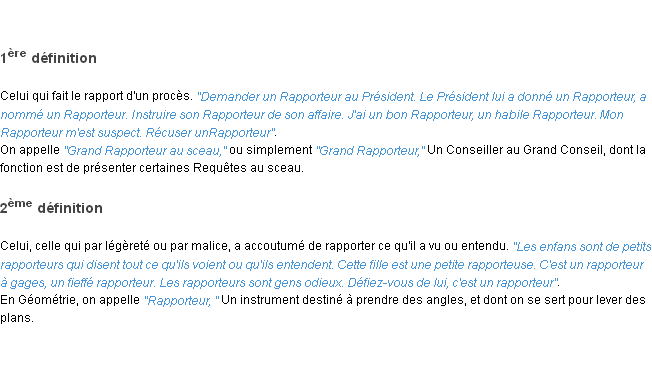 Définition du mot « rapporteur » par l’équipe de la-definition.fr (édition de 2011).Merci à Evrard et Mathieu pour la numérisation du mot rapporteur.