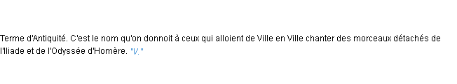 Signification éditée en 1788 pour le terme « rapsode » par J-F. Féraud.Merci à Maximilienne et Gisèle pour la numérisation du mot rapsode.