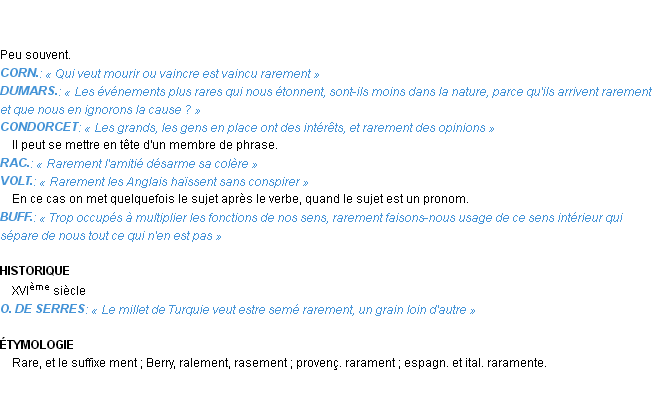 Définition de « rarement » de source académique (Académie Française, parution de 1932).