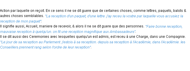 Ancienne signification issue du dico de l’Académie Française, parue en 1694.Merci à Philippe et Paschal pour la numérisation du mot reception.