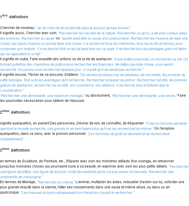 Ancienne définition académique pour le terme « rechercher » (parue en 1798).