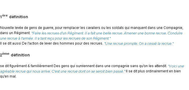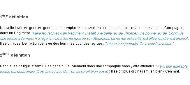 Ancienne signification éditée en 1835 pour le terme « recrue » par l’Académie Française.