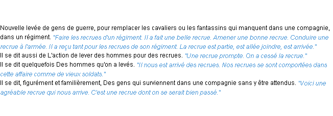 Ancienne définition développée dans dictionnaire académique, 17962.Merci à Arianne et Carole pour la numérisation du mot recrue.
