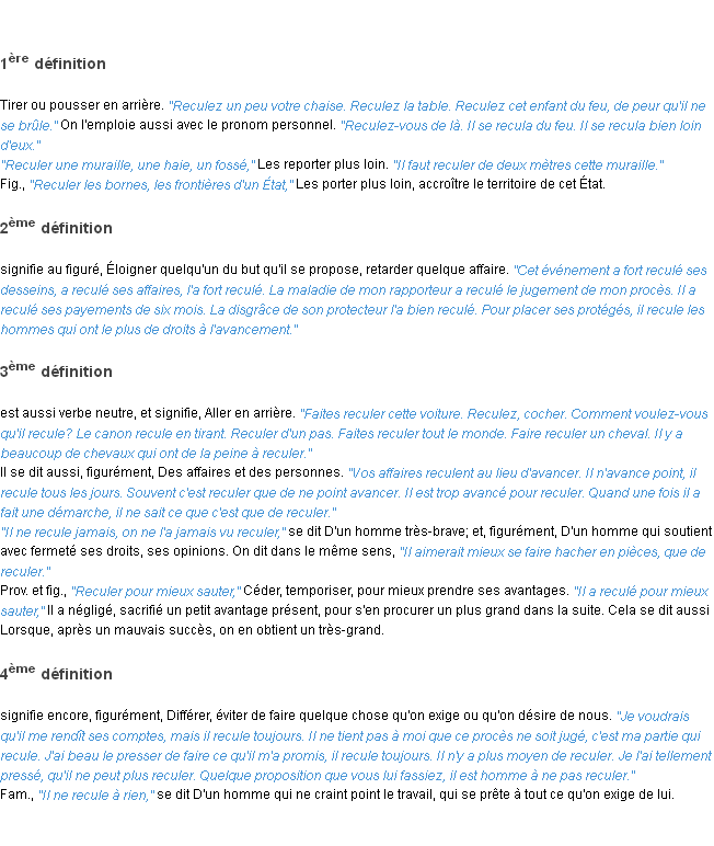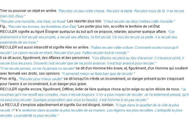 Signification parue en 2009 (source la-definition.fr).Merci à François et Edmond pour la numérisation du mot reculer.