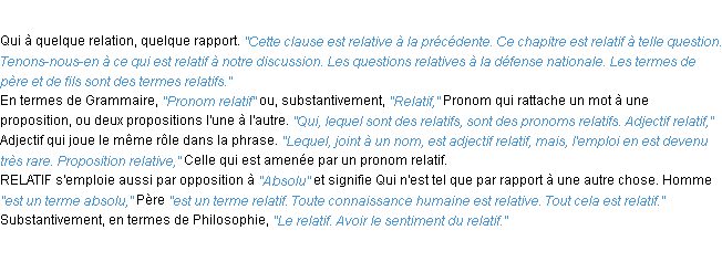 Signification éditée en 2010 par l’équipe de la-definition.fr.Merci à Aristide et Rémi pour la numérisation du mot relatif.