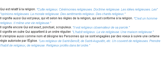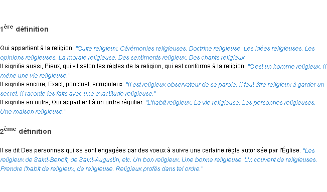 Définition de l’équipe de la-definition.fr (édition de 2009) pour le mot « religieux ».Merci à Colombain et Benoit pour la numérisation du mot religieux.