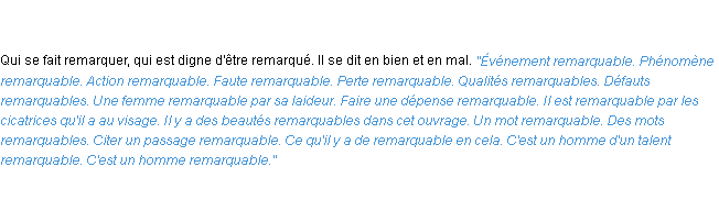 Définition de l’équipe de la-definition.fr (édition de 2009) pour le mot « remarquable ».Merci à Amaury et Angelique pour la numérisation du mot remarquable.