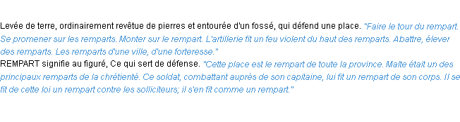 Définition du mot « rempart » par l’équipe de la-definition.fr (édition de 2011).Merci à Geneviève et Dominique pour la numérisation du mot rempart.