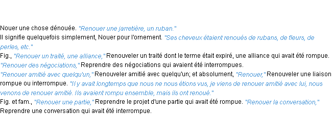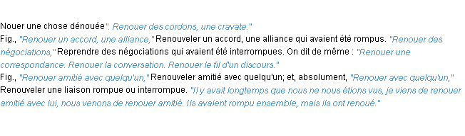 Définition de l’équipe de la-definition.fr (édition de 2009) pour le mot « renouer ».Merci à Charlot et Marc pour la numérisation du mot renouer.