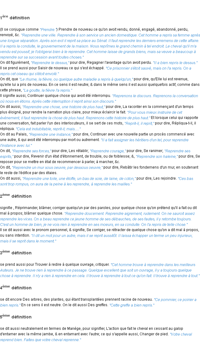 Ancienne signification éditée en 17962 pour le terme « reprendre » par l’Académie Française.Merci à Armelle et Mireille pour la numérisation du mot reprendre.