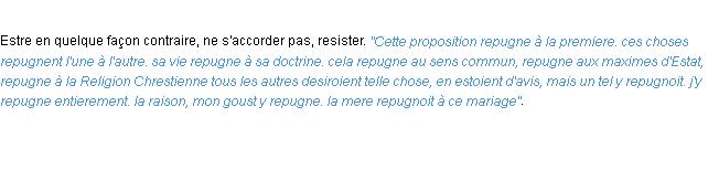 Ancienne signification développée en 1694 par l’académie Française (ACAD - 1694).Merci à Jacques et Josiane pour la numérisation du mot repugner.