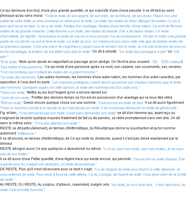 Définition de l’équipe de la-definition.fr (édition de 2009) pour le mot « reste ».Merci à Jérémie et édith pour la numérisation du mot reste.