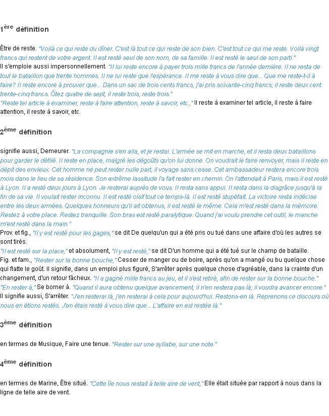 Définition du mot « rester » par l’équipe de la-definition.fr (édition de 2011).Merci à Célestin et Claudette pour la numérisation du mot rester.