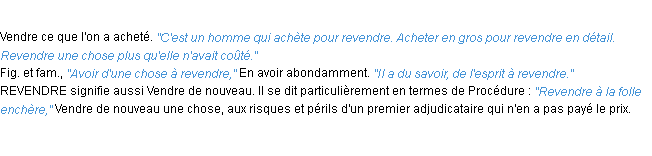 Ancienne définition « revendre » du dictionnaire académique Français, parution de l’année 1835.