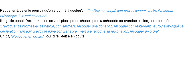 Ancienne signification éditée en 1694 pour le terme « revoquer » par l’Académie Française.Merci à Honoré et Géraud pour la numérisation du mot revoquer.