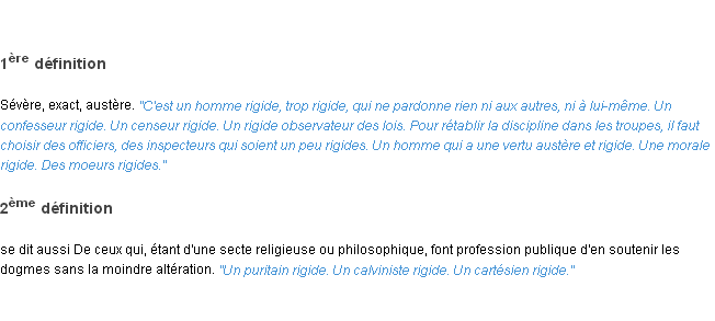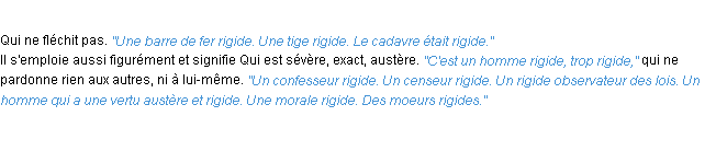 Signification éditée en 2010 par l’équipe de la-definition.fr.Merci à Florianne et Micheline pour la numérisation du mot rigide.
