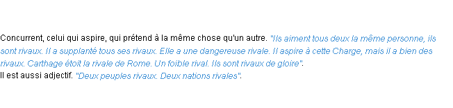 Signification éditée en 2010 par l’équipe de la-definition.fr.Merci à Valérie et Jacques pour la numérisation du mot rival.