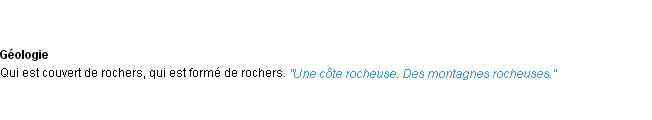 Définition issue du dictionnaire wiktionary pour le mot « rocheux ».